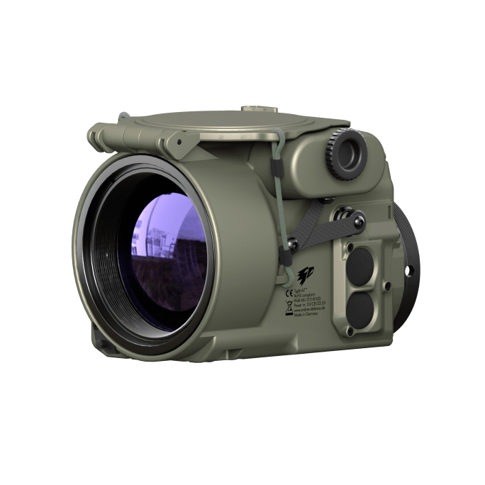 The TigIR-6Z+ is currently the lightest and smallest thermal imaging device with 55mm optics. No other device reaches a range (standing man) of 3000m with such a short overall length of only 111mm. These small dimensions could only be achieved by developing a specially folded eyepiece optics. This allows to use the instrument in front of different spotting scopes (3-7x) etc. without loss of quality. Since the entire housing is made of highly stable aluminium and the objective optics are athermal, the TigIR has outstanding precision even under extreme temperature conditions. The housing surface is hard anodized and coated with a scratch-resistant ceramic lacquer. Thus the TigIR withstands even hard blows in rough environments but is not heavier than 527g and thus lighter than any other comparable device.